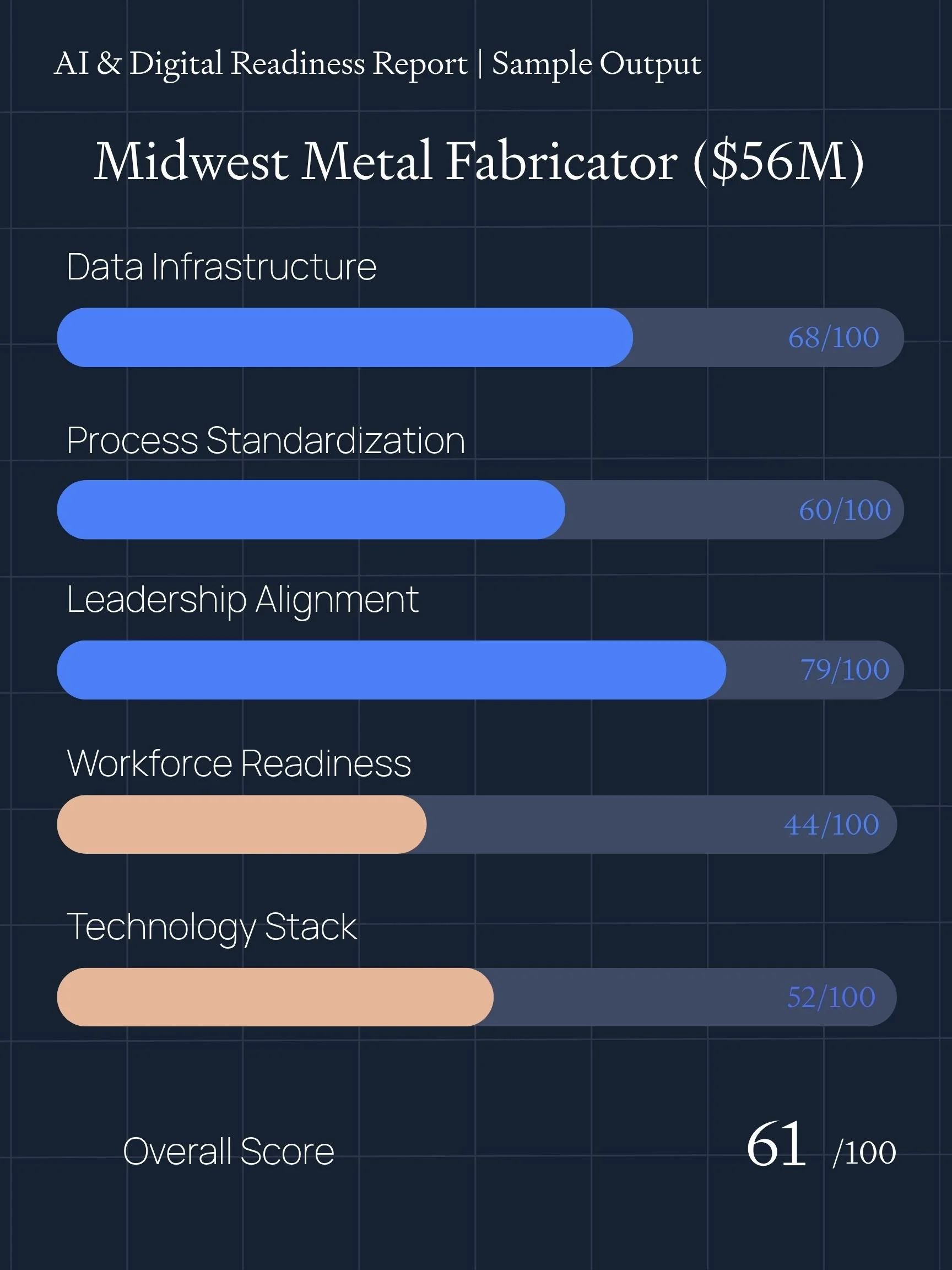 In 30 minutes, we score your business across five key dimensions, benchmark you against manufacturers your size, and give you three prioritized recommendations — specific to your operation.